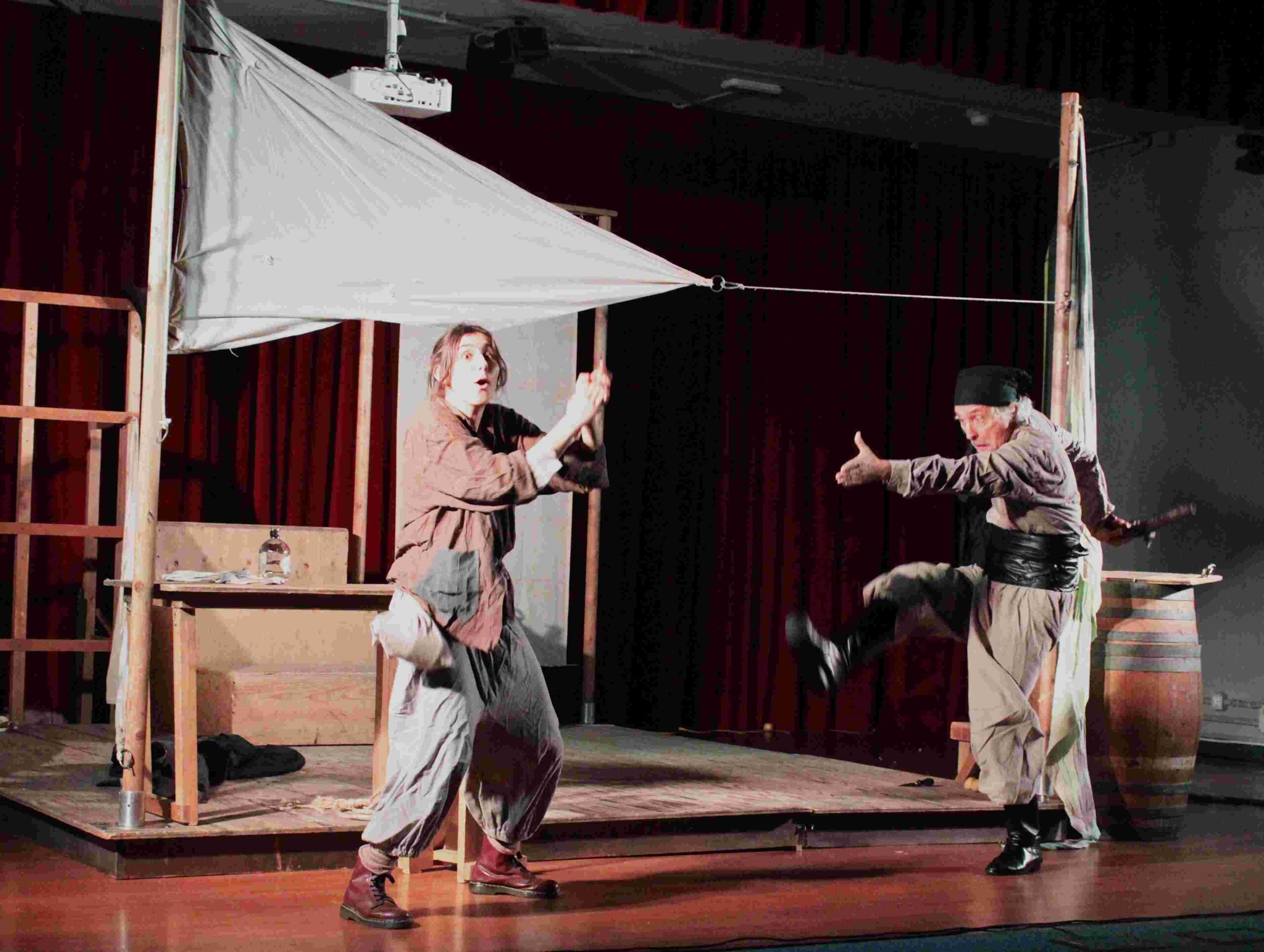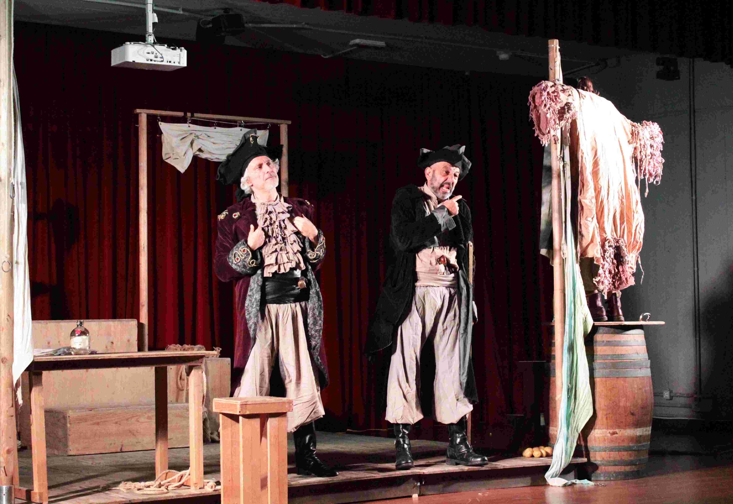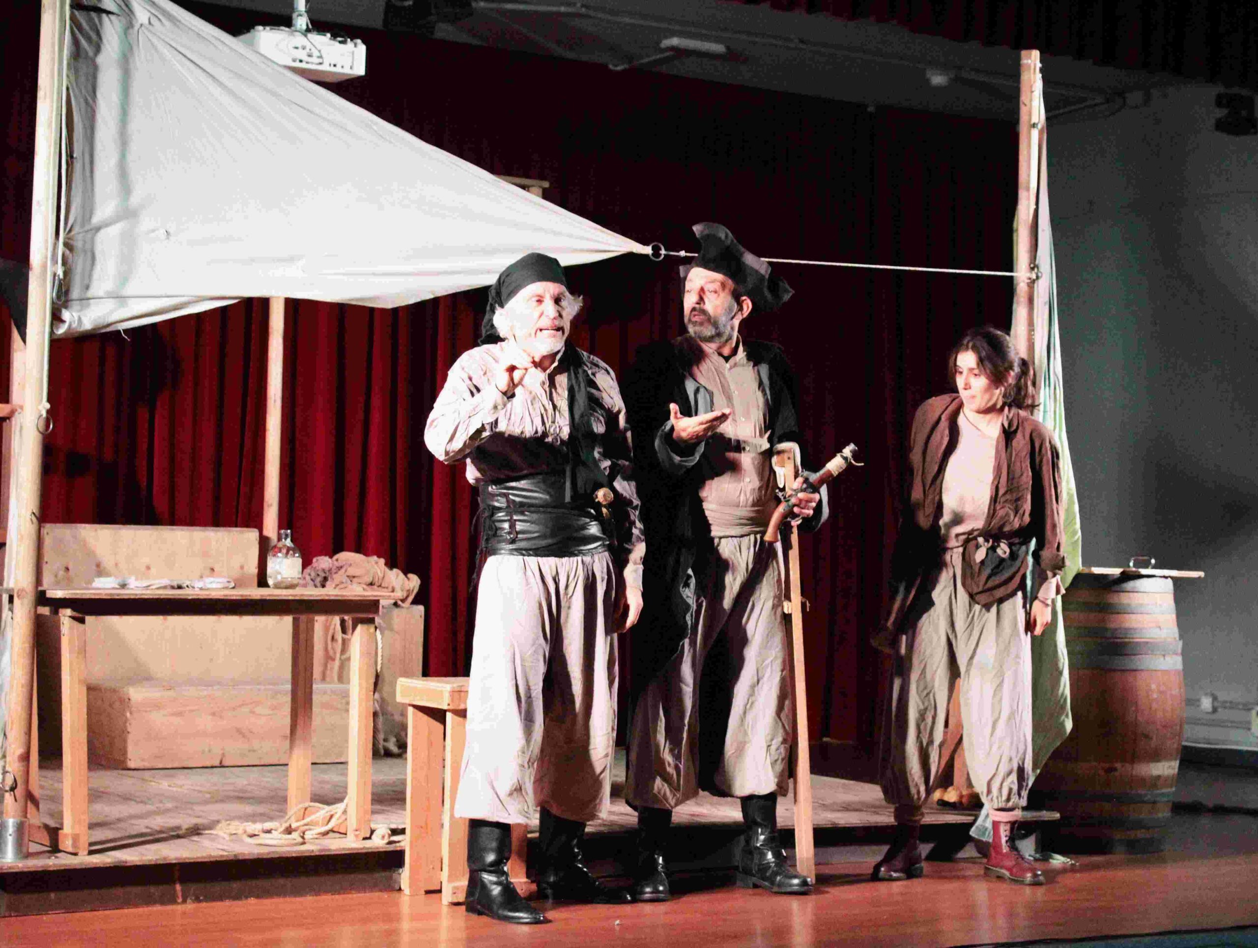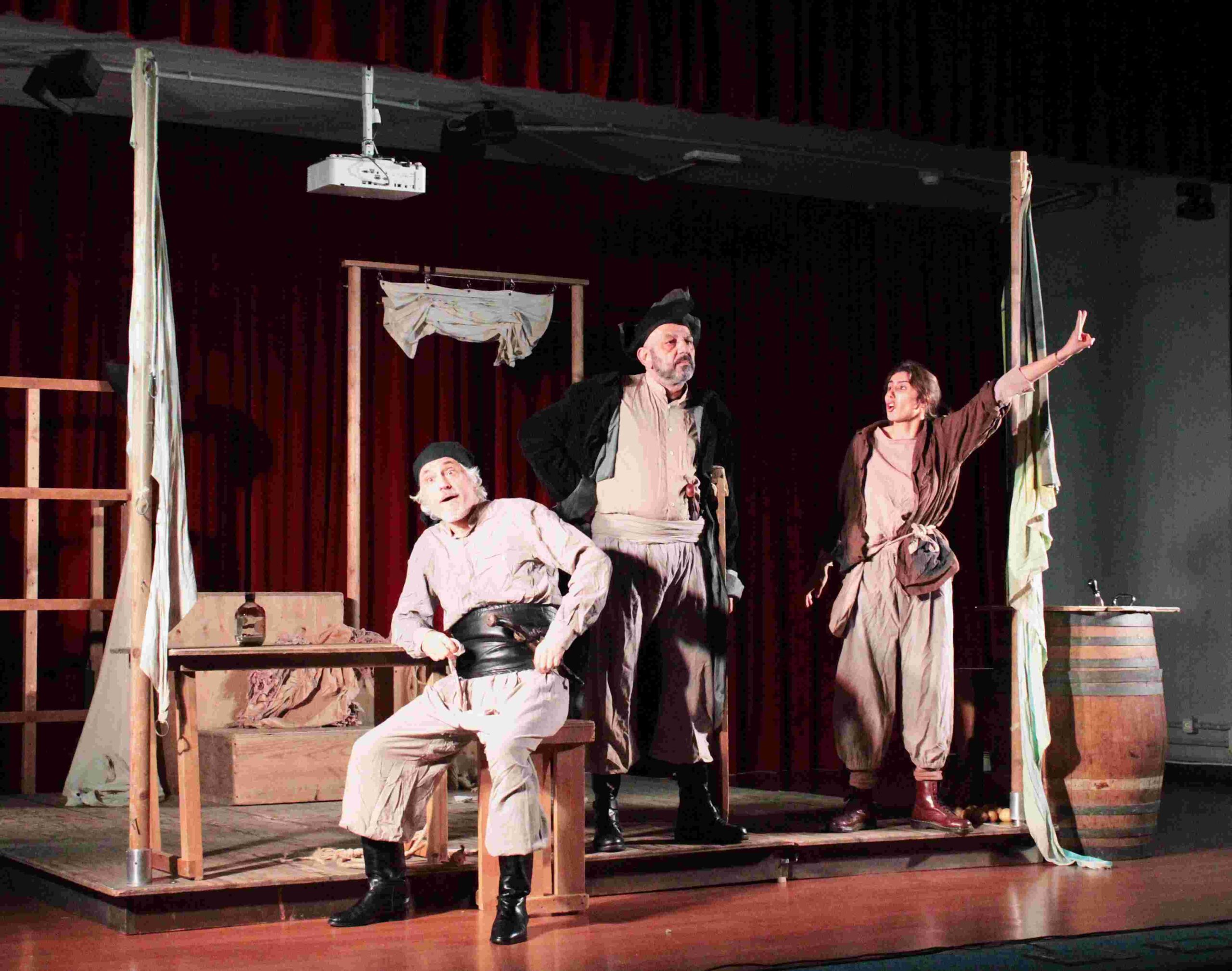 La complessa vicenda del romanzo d’avventura è stata riproposta dai tre bravissimi attori che grazie alle differenti mimiche, e con i costumi di Valeria Bettella, hanno interpretato i molti personaggi del libro, compreso il pappagallo di Long John Silver. La scenografia lignea di Luca Tombolato si trasformerà molte volte. All’inizio è la locanda inglese dove Jim, il figlio del proprietario, incontra Billy Bones, un vecchio marinaio che era stato con il Capitano Flint, famigerato pirata, dove, alla morte di Billy Bones, troverà la famosa mappa del tesoro. Poi sarà la goletta “Hispaniola” che farà vela verso i Caraibi ed infine diventerà la famosa isola. Il tutto grazie a dei teli che vengono tesi come vele o che raffigurano un paesaggio tropicale. Le luci di Andrea Pozzoli segnano il trascorrere del tempo.