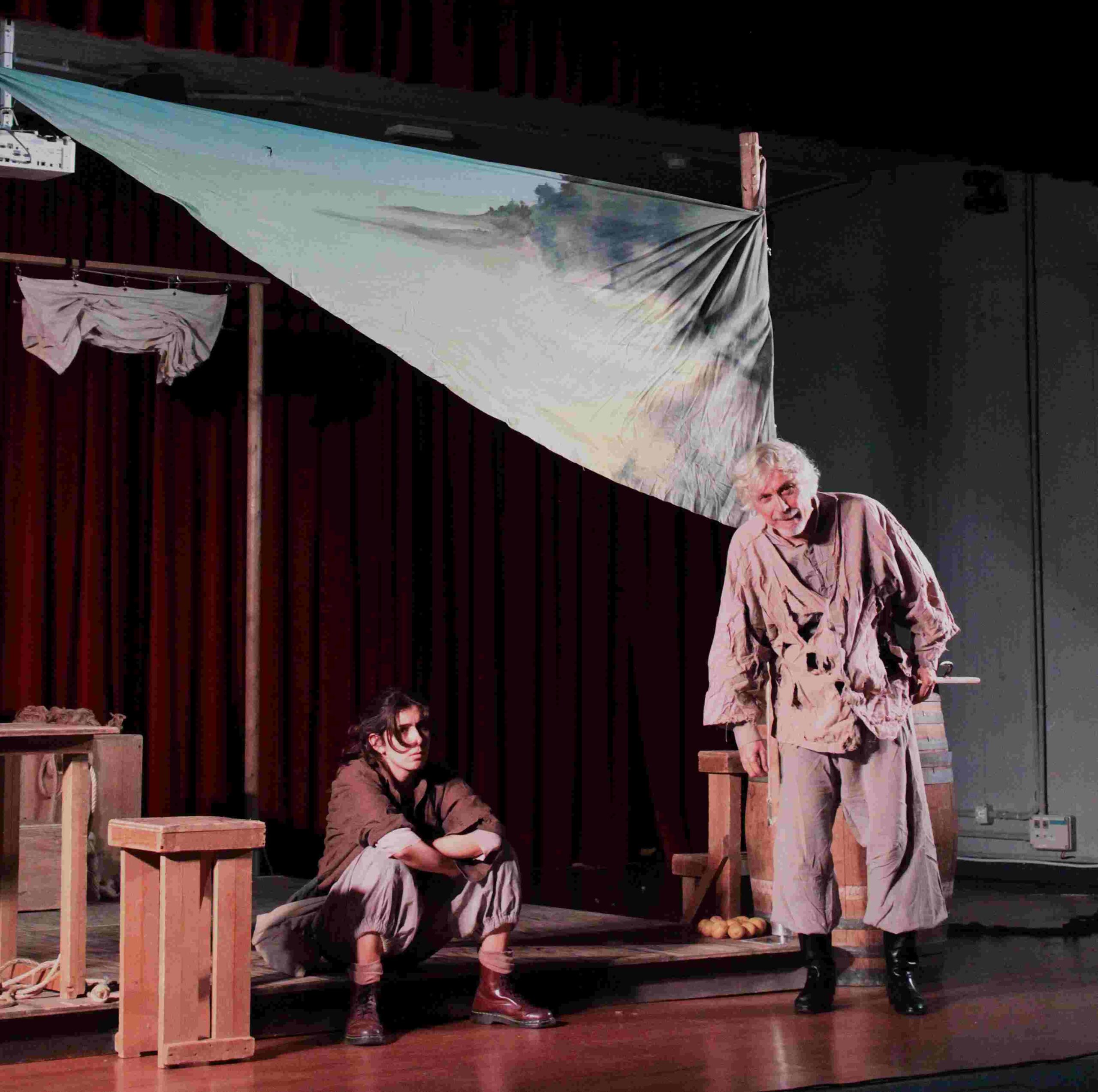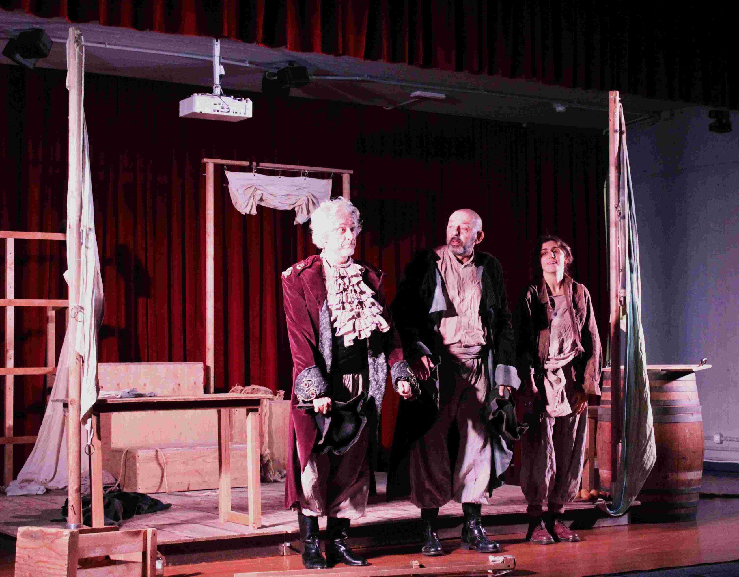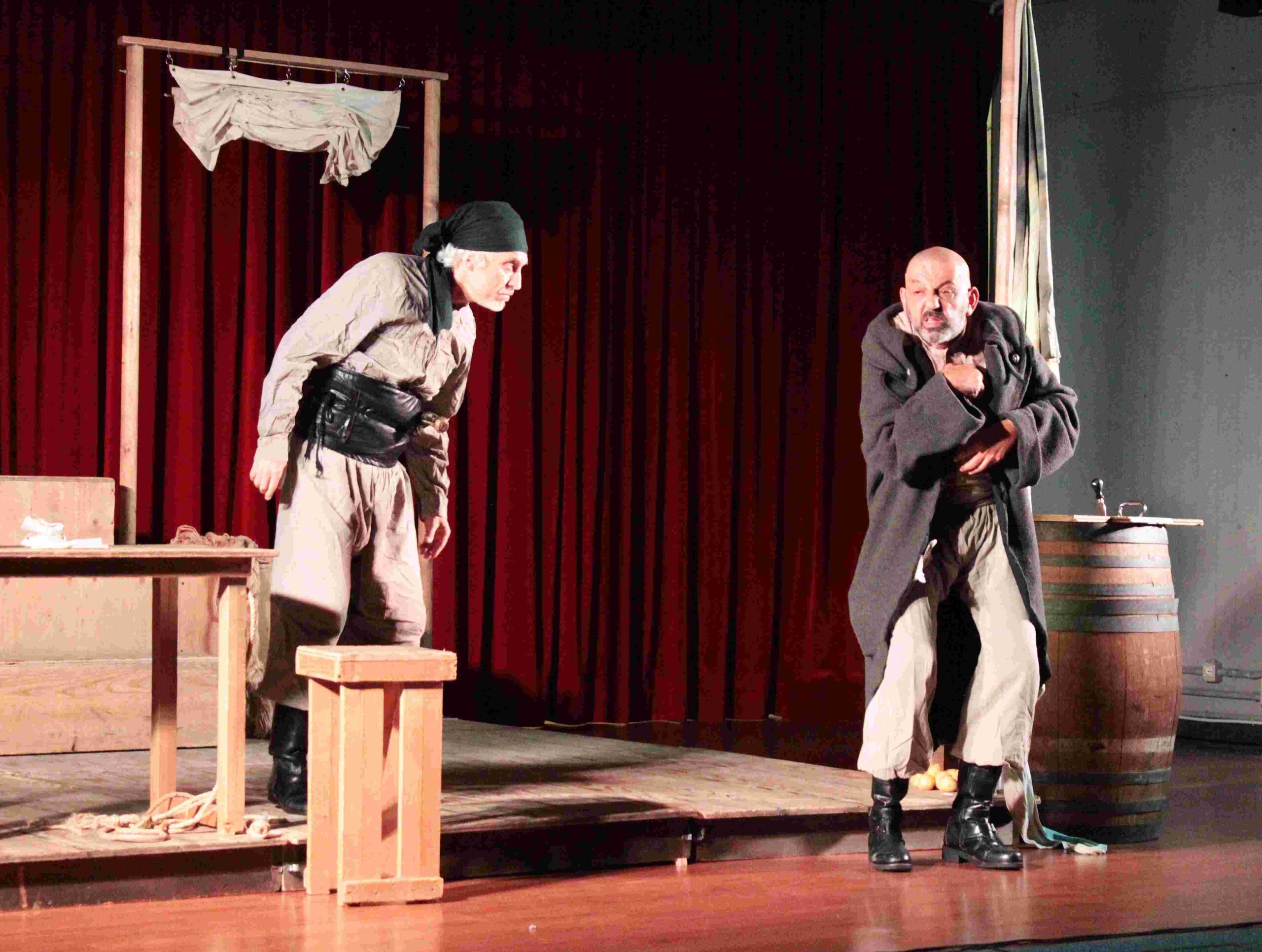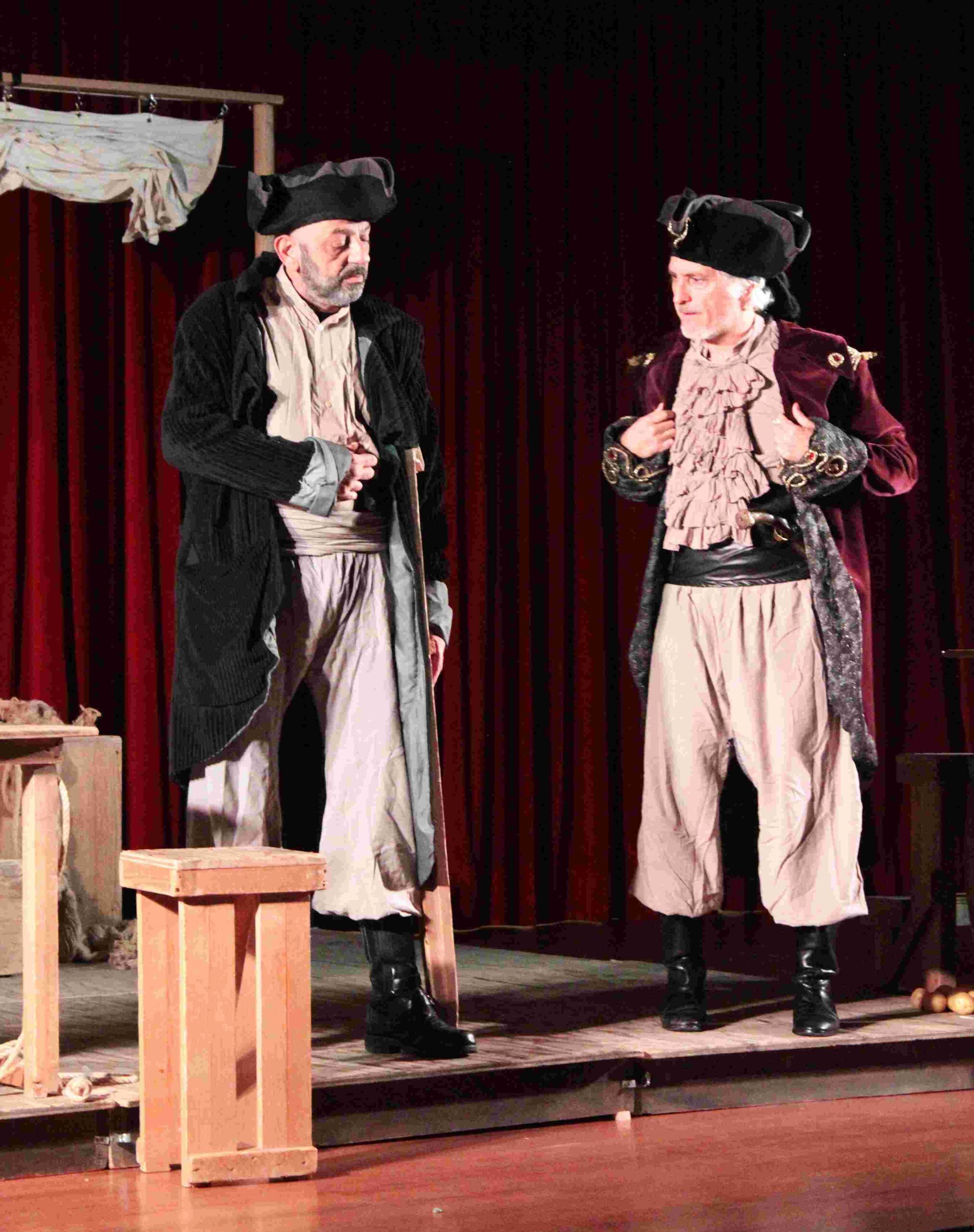 La complessa vicenda del romanzo d’avventura è stata riproposta dai tre bravissimi attori che grazie alle differenti mimiche, e con i costumi di Valeria Bettella, hanno interpretato i molti personaggi del libro, compreso il pappagallo di Long John Silver. La scenografia lignea di Luca Tombolato si trasformerà molte volte. All’inizio è la locanda inglese dove Jim, il figlio del proprietario, incontra Billy Bones, un vecchio marinaio che era stato con il Capitano Flint, famigerato pirata, dove, alla morte di Billy Bones, troverà la famosa mappa del tesoro. Poi sarà la goletta “Hispaniola” che farà vela verso i Caraibi ed infine diventerà la famosa isola. Il tutto grazie a dei teli che vengono tesi come vele o che raffigurano un paesaggio tropicale. Le luci di Andrea Pozzoli segnano il trascorrere del tempo.