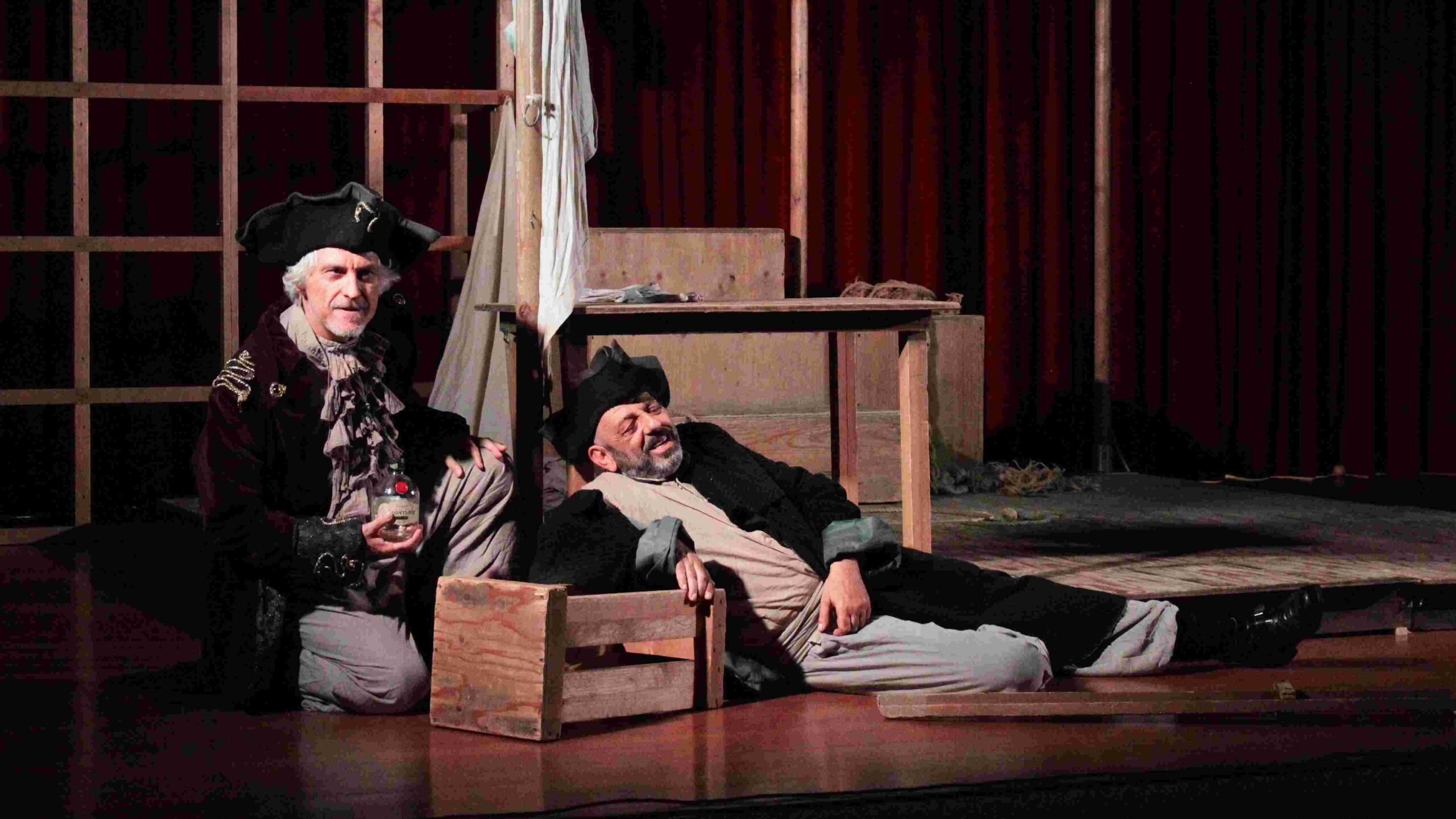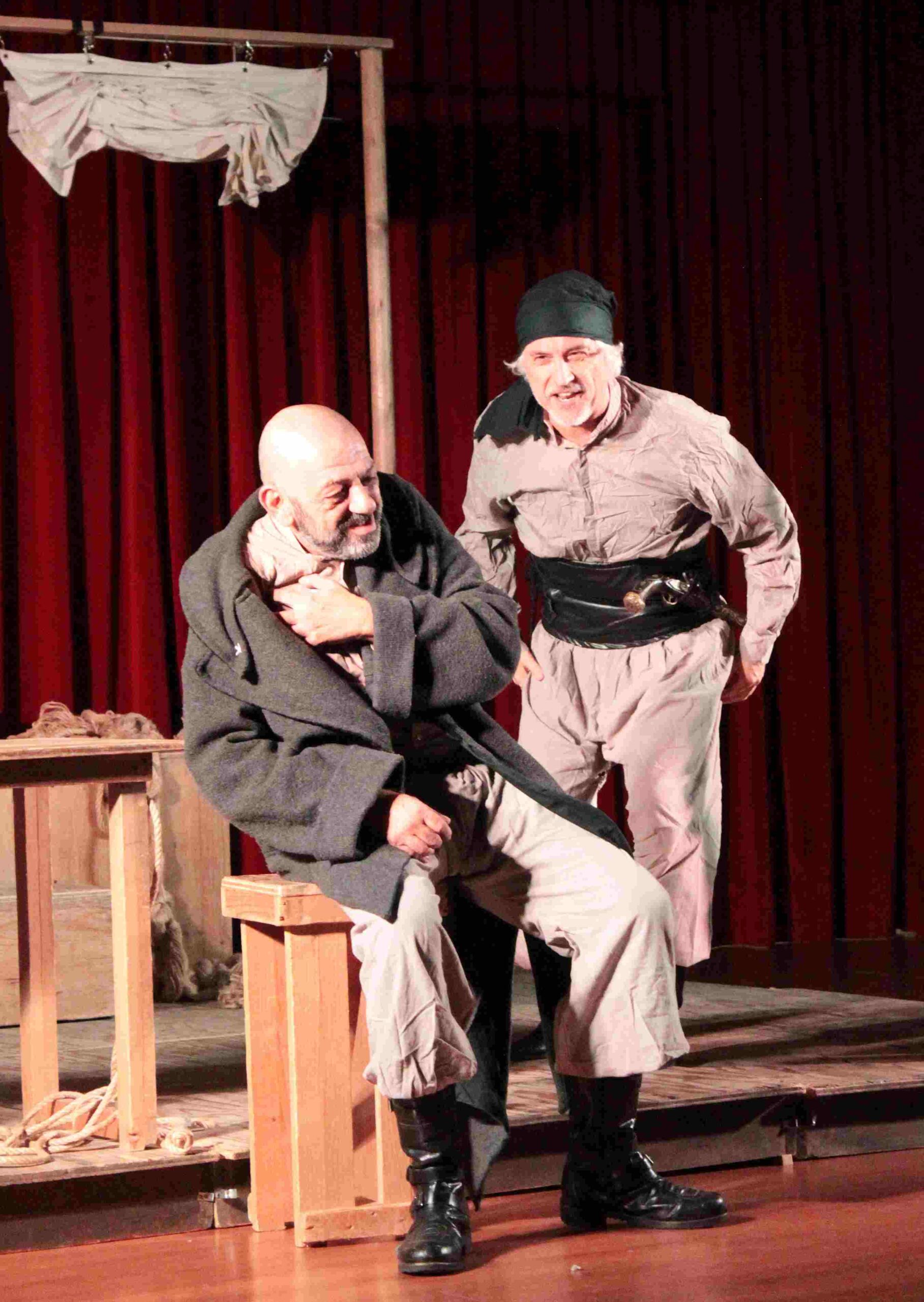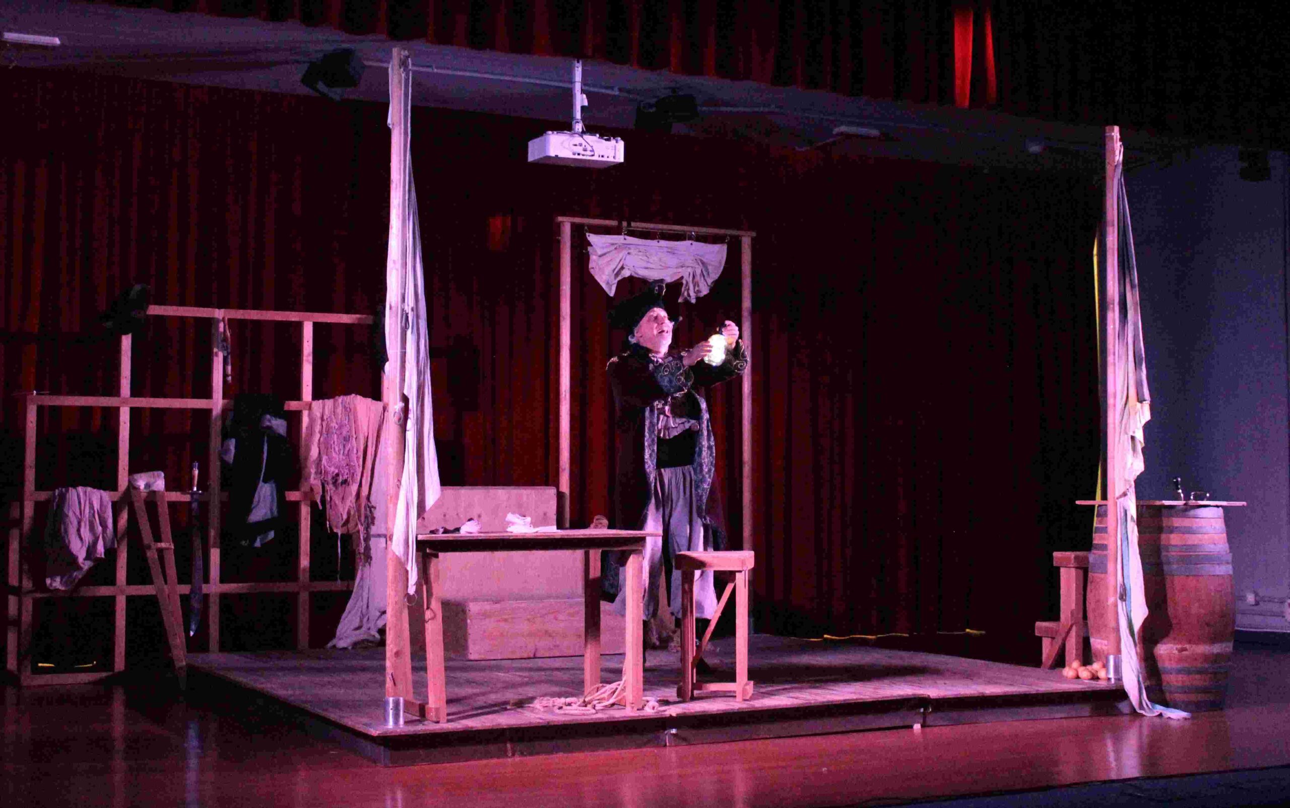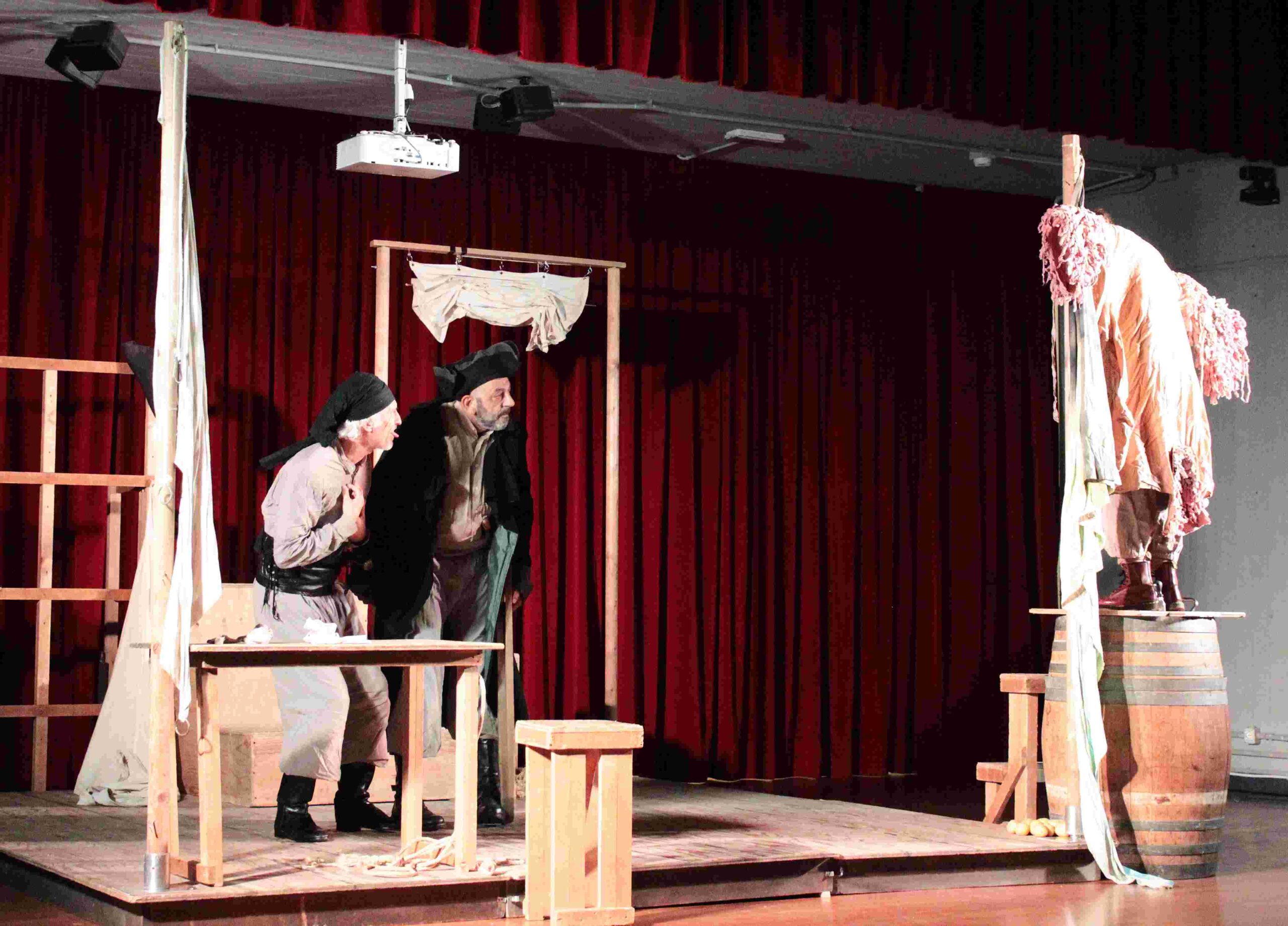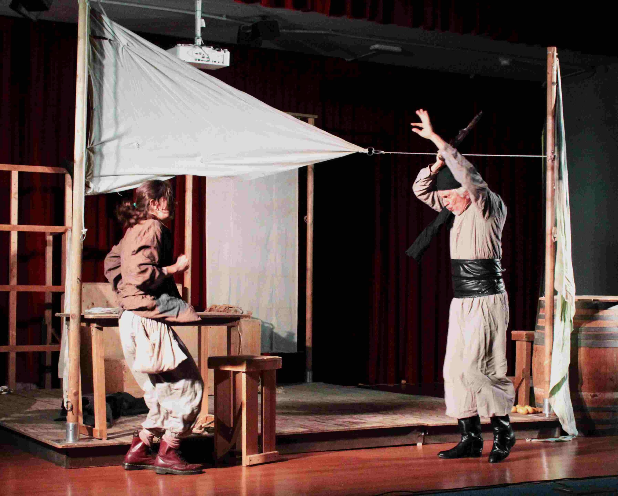 La complessa vicenda del romanzo d’avventura è stata riproposta dai tre bravissimi attori che grazie alle differenti mimiche, e con i costumi di Valeria Bettella, hanno interpretato i molti personaggi del libro, compreso il pappagallo di Long John Silver. La scenografia lignea di Luca Tombolato si trasformerà molte volte. All’inizio è la locanda inglese dove Jim, il figlio del proprietario, incontra Billy Bones, un vecchio marinaio che era stato con il Capitano Flint, famigerato pirata, dove, alla morte di Billy Bones, troverà la famosa mappa del tesoro. Poi sarà la goletta “Hispaniola” che farà vela verso i Caraibi ed infine diventerà la famosa isola. Il tutto grazie a dei teli che vengono tesi come vele o che raffigurano un paesaggio tropicale. Le luci di Andrea Pozzoli segnano il trascorrere del tempo.