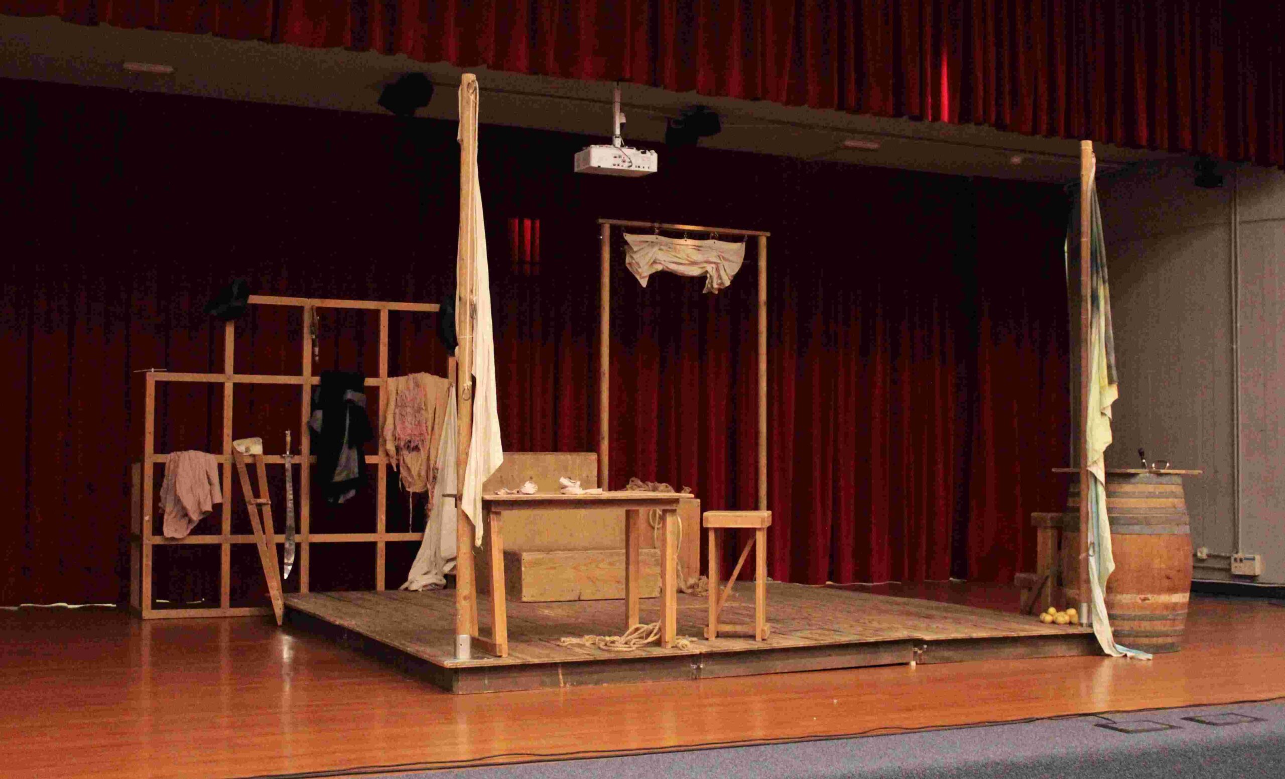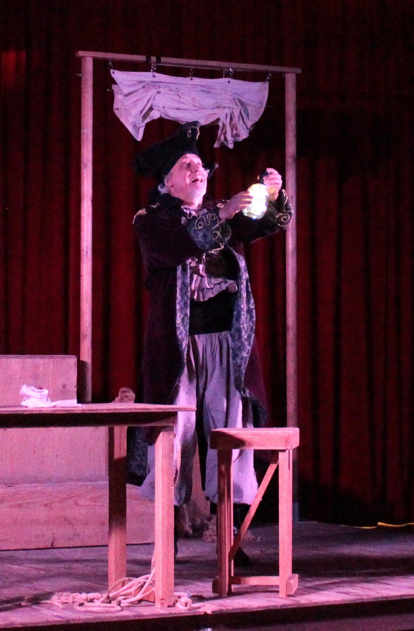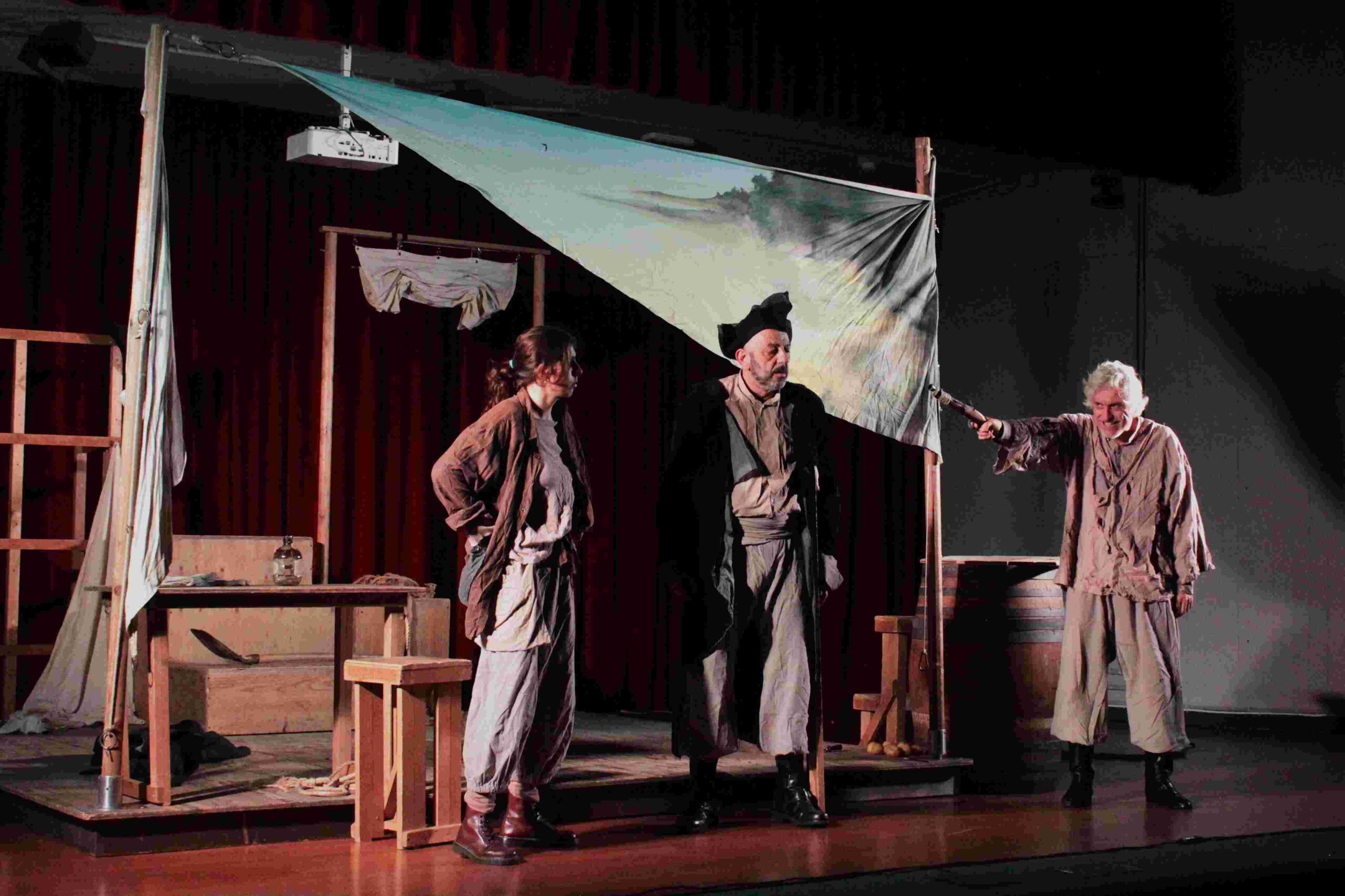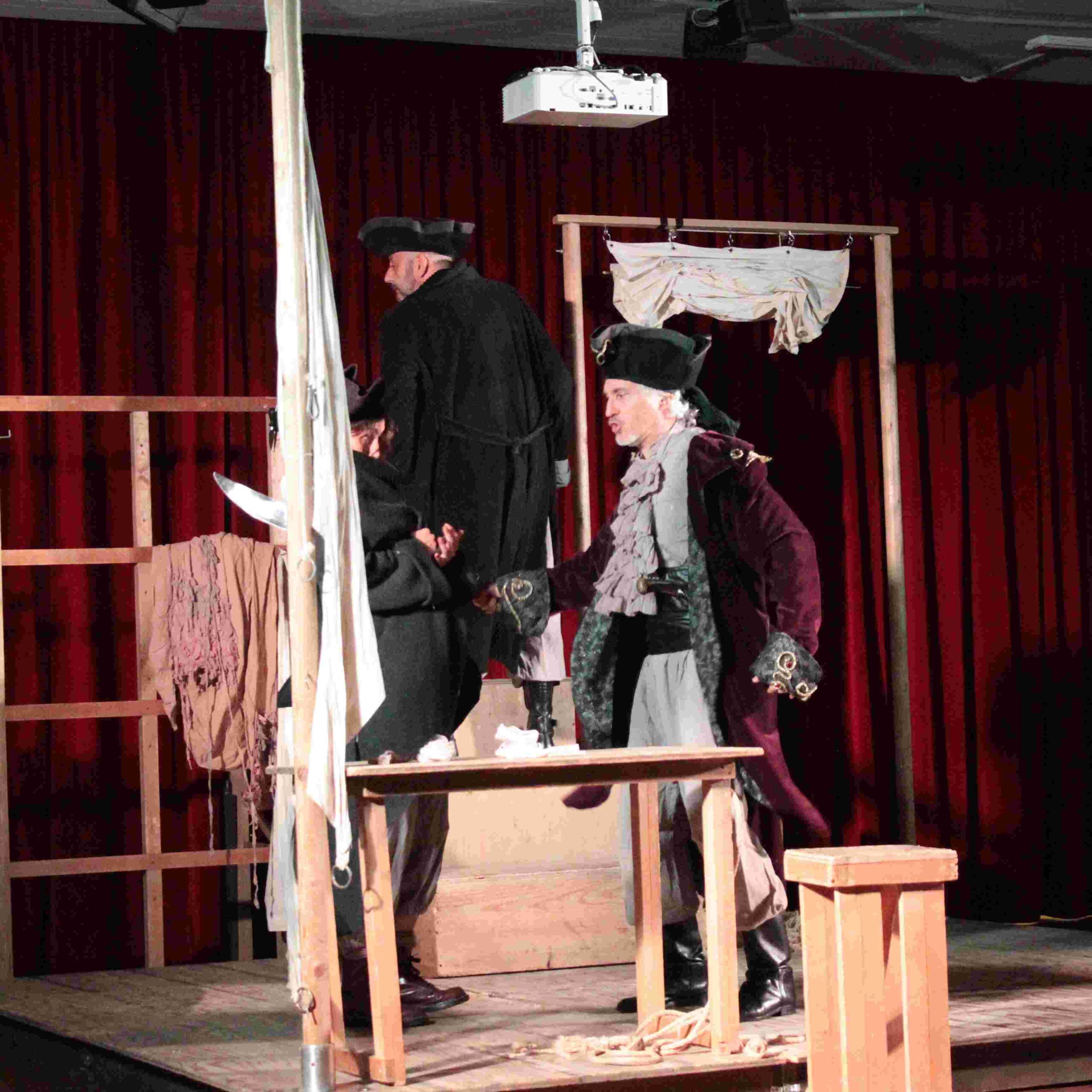 La complessa vicenda del romanzo d’avventura è stata riproposta dai tre bravissimi attori che grazie alle differenti mimiche, e con i costumi di Valeria Bettella, hanno interpretato i molti personaggi del libro, compreso il pappagallo di Long John Silver. La scenografia lignea di Luca Tombolato si trasformerà molte volte. All’inizio è la locanda inglese dove Jim, il figlio del proprietario, incontra Billy Bones, un vecchio marinaio che era stato con il Capitano Flint, famigerato pirata, dove, alla morte di Billy Bones, troverà la famosa mappa del tesoro. Poi sarà la goletta “Hispaniola” che farà vela verso i Caraibi ed infine diventerà la famosa isola. Il tutto grazie a dei teli che vengono tesi come vele o che raffigurano un paesaggio tropicale. Le luci di Andrea Pozzoli segnano il trascorrere del tempo.