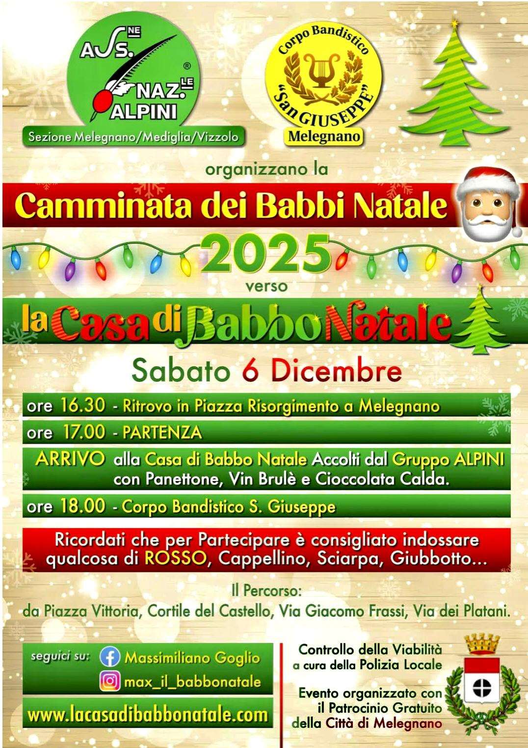 Nel pomeriggio di sabato 6 dicembre la “Camminata dei Babbi Natale”, partita da piazza Risorgimento, ha portato numerose famiglie sino a via dei Platani per assistere all’accensione della “Casa di Babbo Natale”, una villetta che ogni anno, da S. Ambrogio sino alla Befana, offre uno spettacolo da fiaba con l’accensione di oltre 570mila luci. La passeggiata, guidata dagli alpini in moto, ha trovato all’arrivo il vin brûlé, la cioccolata calda, il panettone e il pandoro sempre offerti dal gruppo alpini di Melegnano-Mediglia-Vizzolo. Il tutto accompagnato dalle note della banda musicale San Giuseppe.