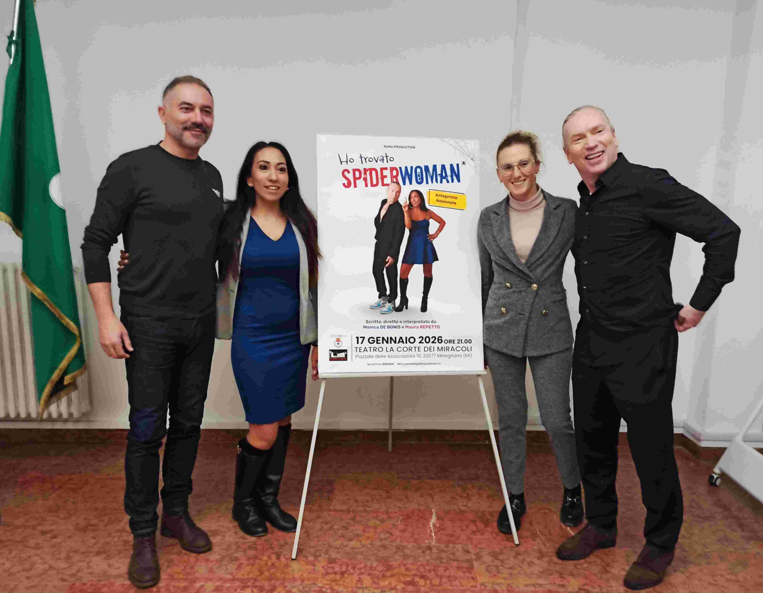 Monica De Bonis e Mauro Repetto hanno scelto Melegnano per l’anteprima del loro nuovo spettacolo dal titolo “Ho trovato Spider Woman” in scena sabato 17 gennaio, al teatro La Corte dei Miracoli. Nella conferenza stampa che si è tenuta nel Municipio di Melegnano a cui hanno presenziato il sindaco Vito Bellomo, l’assessora Serena Mazza e il responsabile dell’ufficio stampa Andrea Grassani, Repetto ha fatto subito notare che la scelta del comune di Melegnano non è stata casuale. È stato un po’ come giocare in casa, data la vicinanza con la sua Pavia.